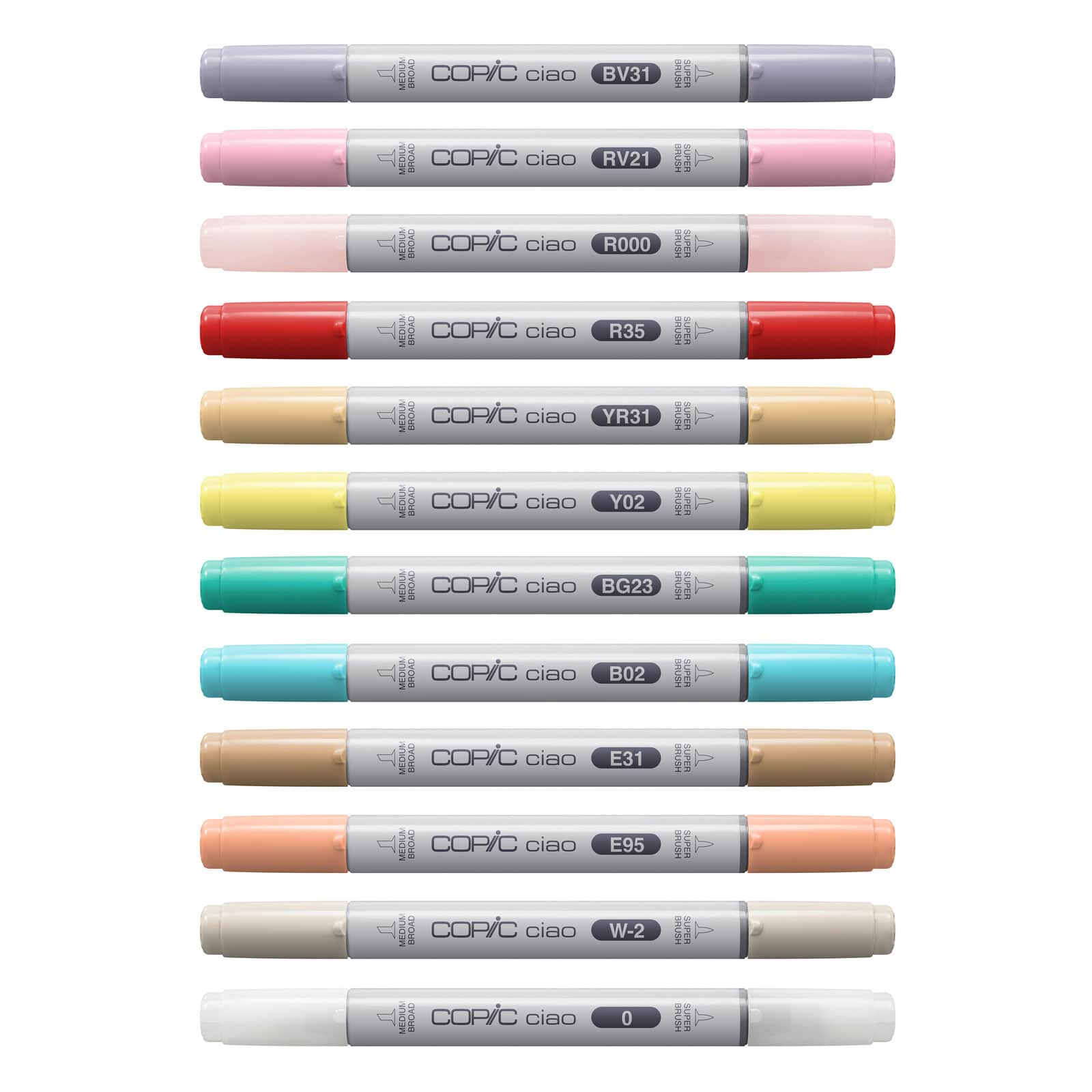 - COPIC® ciao Markers: Pale Lavender BV31, Light Pink RV21, Cherry White R000, Coral R35, Light Reddish Yellow YR31, Canary Yellow Y02, Coral Sea BG23, Robin's Egg Blue B02, Brick Beige E31, Tea Orange E95, Warm Gray No.2 W2, Colorless Blender 0