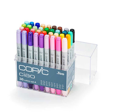 COPIC® ciao 36PC Marker Set (A) includes: Cool Gray No. 3 C3, Black 100, Frost Blue B00, Sky B24, Ultramarine B29, Aqua Blue BG01, Blue Green BG09, Coral Sea BG23, Mauve Shadow BV00, Prune BV02, Blue Violet BV08, Cotton Pearl E00, Soft Sun E21, Burnt Umber E29, Sepia E37, Jade Green G00, Emerald Green G05, Forest Green G17, Blush R20, Lipstick Red R29, Peach R32, Sugared Almond Pink RV02, Shock Pink RV04, Pale Pink RV10, Lilac V04, Violet V09, Pale Lilac V12, Barium Yellow Y00, Yellow Y06, Golden Yellow Y17, Yellow Green YG03, Yellowish Green YG06, Mignonette YG11, Light Orange YR02, Cadmium Orange YR07, and Yellowish Shade YR20