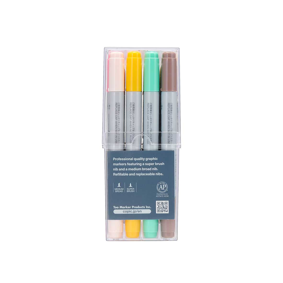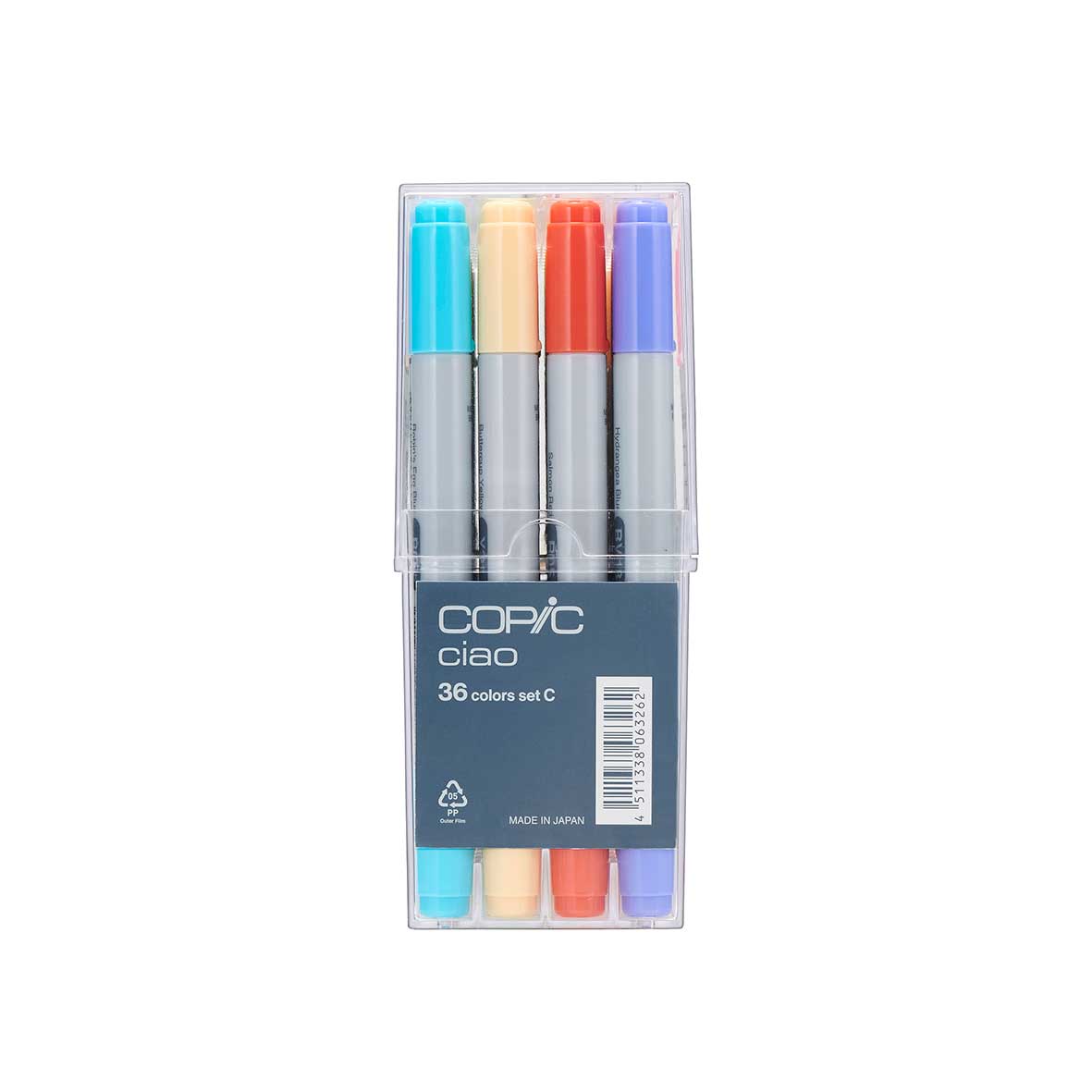 COPIC® Ciao 36PC Marker Set (C) includes: Robin's Egg Blue B02, Ice Blue B12,Pale Blue Gray B60, Light Hydrangea B63, Holiday Blue BG05, Horizon Green BG34, Hydrangea Blue BV13, Grayish Lavender BV23, Pale Lavender BV31, Barley Beige E11, Brick Beige E31, Egg Shell E50, Raw Silk E53, Champagne E71, Pale Green G000, Nile Green G07, Apple Green G14, Pinkish White R00, Salmon Red R05, Pale Cherry Pink R11, Light Prawn R22, Pale Purple RV000, Cerise RV06, Tender Pink RV13, Pale Heath V000, Lavender V06, Pale Yellow Y11, Pumpkin Yellow Y15, Buttercup Yellow Y21, Mimosa Yellow YG00, New Leaf YG23, Pea Green YG63, Apricot YR16, Yellow Ochre YR23, Light Reddish Yellow YR31, and Spring Orange YR61