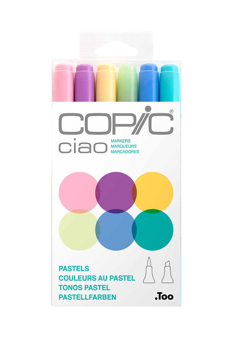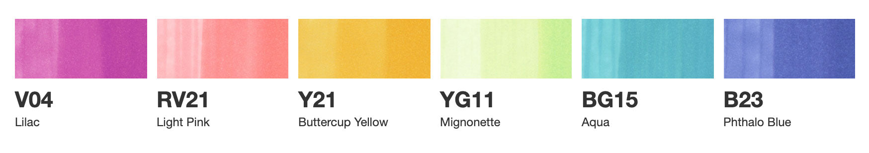 COPIC® ciao Pastels 6PC Set Includes: Light Pink RV21, Lilac V04, Buttercup Yellow Y21, Mignonette YG11, Phthalo Blue B23, Aqua BG15