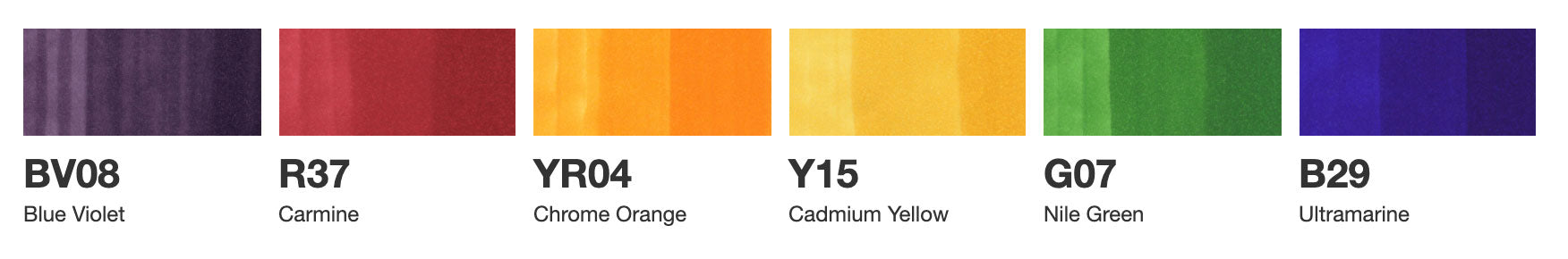 COPIC® ciao Primary 6PC Set Includes: Carmine R37, Chrome Orange YR04, Cadmium Yellow Y15, Nile Green G07, Ultramarine B29, Blue Violet BV08