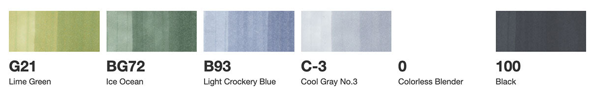 COPIC® ciao Sea 6PC Set Includes: Cool Gray No. 3 C3, Lime Green G21, Ice Ocean BG72, Light Crockery Blue B93, Black 100, and Colorless Blender 0