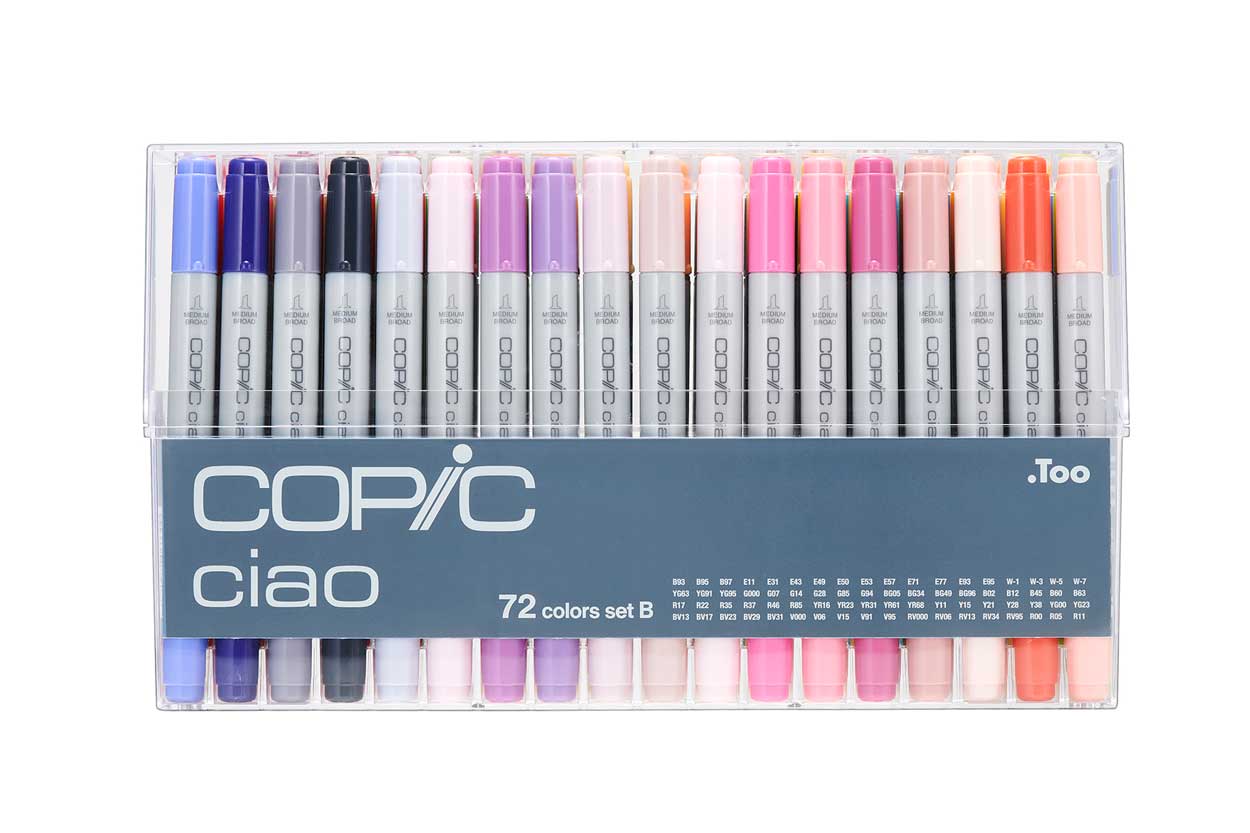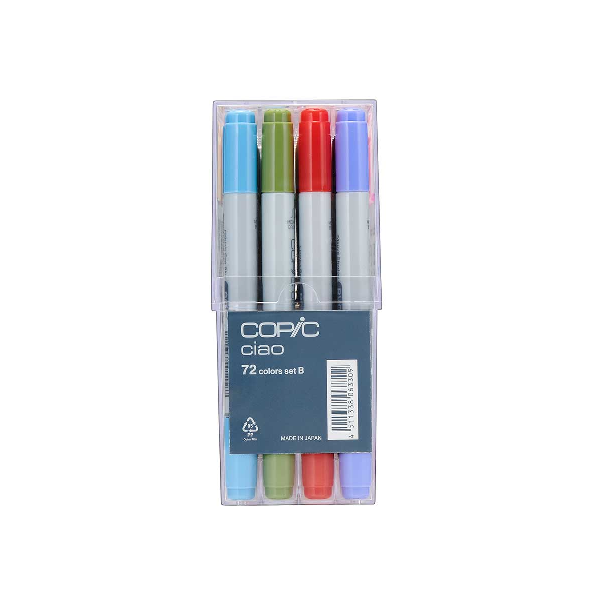COPIC® Ciao 72PC Marker Set (B) includes: Warm Gray No. 1 W1, Warm Gray No. 3 W3, Warm Gray No. 5 W5,Warm Gray No. 7 W7, Robin's Egg Blue B02, Ice Blue B12, Smoky Blue B45, Pale Blue Gray B60, Light Hydrangea B63, Light Crockery Blue B93, Light Grayish Cobalt B95, Night Blue B97, Holiday Blue BG05, Horizon Green BG34, Duck Blue BG49, Bush BG96, Hydrangea Blue BV13, Deep Reddish Blue BV17, Grayish Lavender BV23, Slate BV29, Pale Lavender BV31, Barley Beige E11, Brick Beige E31, Dull Ivory E43, Dark Bark E49, Egg Shell E50, Raw Silk E53, Light Walnut E57, Champagne E71, Maroon E77, Tea Rose E93, Tea Orange E95, Pale Green G000, Nile Green G07, Apple Green G14, Ocean Green G28, Verdigris G85, Grayish Olive G94, Pinkish White R00, Salmon Red R05, Pale Cherry Pink R11, Lipstick Orange R17, Light Prawn R22, Coral R35, Carmine R37, Strong Red R46, Rose Red R85, Pale Purple RV000, Cerise RV06, Tender Pink RV13, Dark Pink RV34, Baby Blossoms RV95, Pale Purple V000, Lavender V06, Mallow V15, Pale Grape V91, Light Grape V95, Pale Yellow Y11, Cadmium Yellow Y15, Buttercup Yellow Y21, Lionet Gold Y28, Honey Y38, Mimosa Yellow YG00, New Leaf YG23, Pea Green YG63, Putty YG91, Pale Olive YG95, Apricot YR16, Yellowish Beige YR23, Light Reddish Yellow YR31, Spring Orange YR61, and Orange YR68