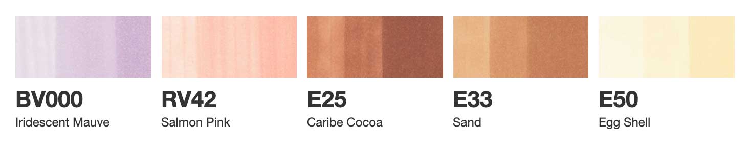 - COPIC® Ciao Markers: Caribe Cocoa E25, Sand E33, Egg Shell E50, Salmon Pink RV42, and Mauve Shadow BV00