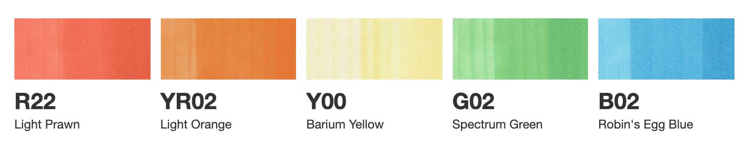 - COPIC® Ciao Markers: Robin's Egg Blue B02, Spectrum Green G02, Barium Yellow Y00, Light Orange YR02, and Light Prawn R22