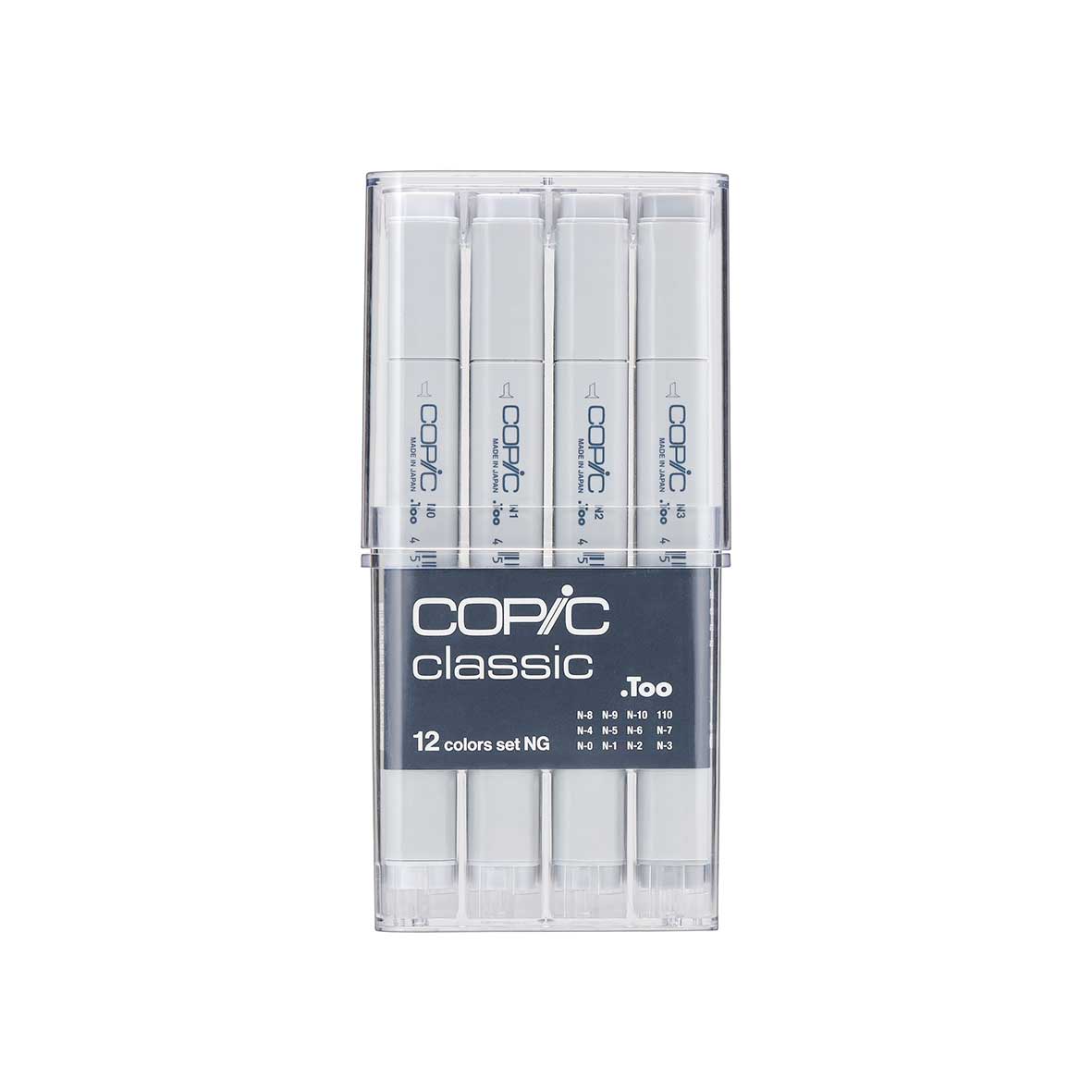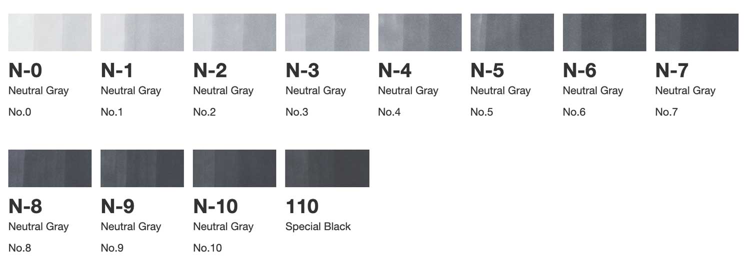 COPIC® Classic Neutral Gray 12PC Set includes Neutral Gray 0-10: N0, N1, N2, N3, N4, N5, N6, N7, N8, N9, N10, and Special Black 110