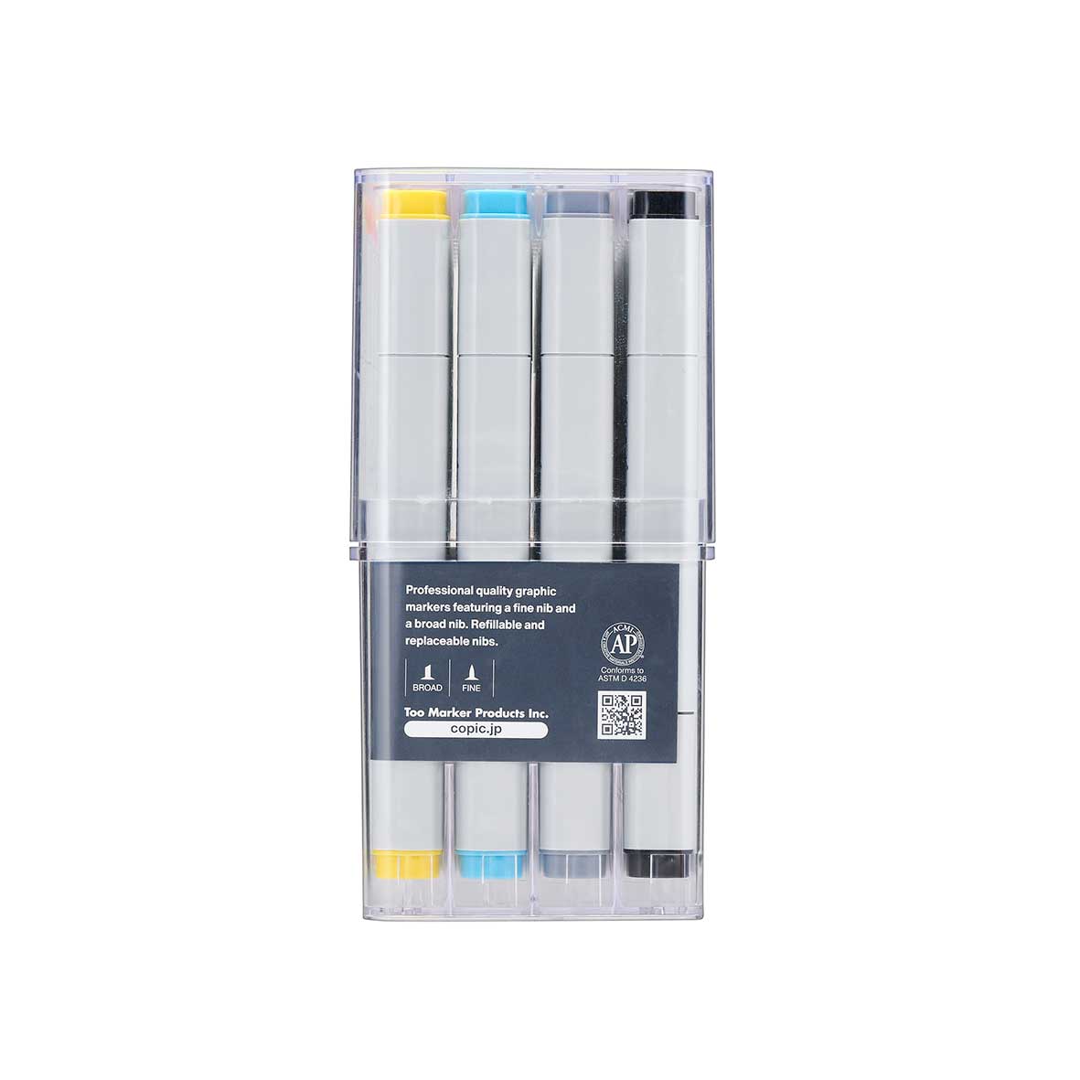 COPIC® Classic Basic 12PC Set includes: Cool Gray C1, Cool Gray C3, Cool Gray C5, Cool Gray C7, Cool Gray C9, Warm Gray W1, Warm Gray W3, Warm Gray W5, Warm Gray W7, Warm Gray W9, Black 100, Special Black 110, Process Blue B05, Peacock Blue B06, Light Blue B14, Ultramarine B29, Pale Blue B32, Prussian Blue B39, Burnt Sienna E09, Burnt Umber E29, Sand E33, Nile Green G07, Forest Green G17, Lime Green G21, Ocean Green G28, Rose Salmon R02, Vermillion R08, Pink RV11, Crimson RV29, Violet V09, Pale Yellow Y11, Lemon Yellow Y13, Cadmium Yellow Y15, Yellow Green YG03, Chrome Orange YR04, and Pale Sepia YR24