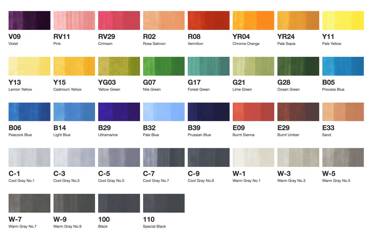 COPIC® Classic Basic 36PC Set includes: Cool Gray C1, Cool Gray C3, Cool Gray C5, Cool Gray C7, Cool Gray C9, Warm Gray W1, Warm Gray W3, Warm Gray W5, Warm Gray W7, Warm Gray W9, Black 100, Special Black 110, Process Blue B05, Peacock Blue B06, Light Blue B14, Ultramarine B29, Pale Blue B32, Prussian Blue B39, Burnt Sienna E09, Burnt Umber E29, Sand E33, Nile Green G07, Forest Green G17, Lime Green G21, Ocean Green G28, Rose Salmon R02, Vermillion R08, Pink RV11, Crimson RV29, Violet V09, Pale Yellow Y11, Lemon Yellow Y13, Cadmium Yellow Y15, Yellow Green YG03, Chrome Orange YR04, and Pale Sepia YR24