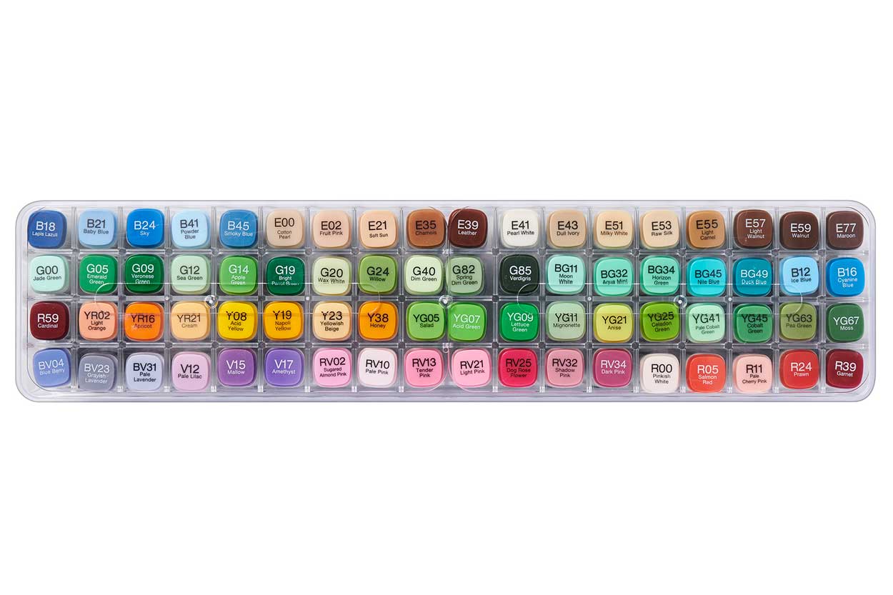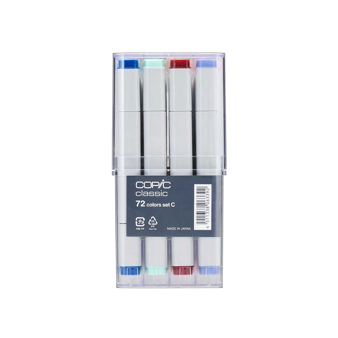 COPIC® Classic 72PC Market Set C includes: Ice Blue B12, Cyanine Blue B16, Lapis Lazuli B18, Baby Blue B21, Sky B24, Powder Blue B41, Smoky Blue B45, Moon White BG11, Aqua Mist BG32, Horizon Green BG34, Nile Blue BG45, Duck Blue BG49, Blue Berry BV04, Grayish Lavender BV23, Pale Lavender BV31, Cotton Pearl E00, Fruit Pink E02, Soft Sun E21, Chamois E35, Leather E39, Pearl White E41, Dull Ivory E43, Milky White E51, Raw Silk E53, Light Camel E55, Light Walnut E57, Walnut E59, Maroon E77, Jade Green G00, Emerald Green G05, Veronese Green G09, Sea Green G12, Apple Green G14, Bright Parrot Green G19, Wax White G20, Willow G24, Dim Green G40, Spring Dim Green G82, Verdigris G85, Pinkish White R00, Salmon Red R05, Pale Cherry Pink R11, Prawn R24, Garnet R39, Cardinal R59, Sugared Almond Pink RV02, Pale Pink RV10, Tender Pink RV13, Light Pink RV21, Dog Rose Flower RV25, Shadow Pink RV32, Dark Pink RV34, Pale Lilac V12, Mallow V15, Amethyst V17, Acid Yellow Y08, Napoli Yellow Y19, Yellowish Beige Y23, Honey Y38, Salad YG05, Acid Green YG07, Lettuce Green YG09, Mignonette YG11, Anise YG21, Celadon Green YG25, Pale Cobalt Green YG41, Cobalt Green YG45, Pea Green YG63, Moss YG67, Light Orange YR02, Apricot YR16, and Cream YR21