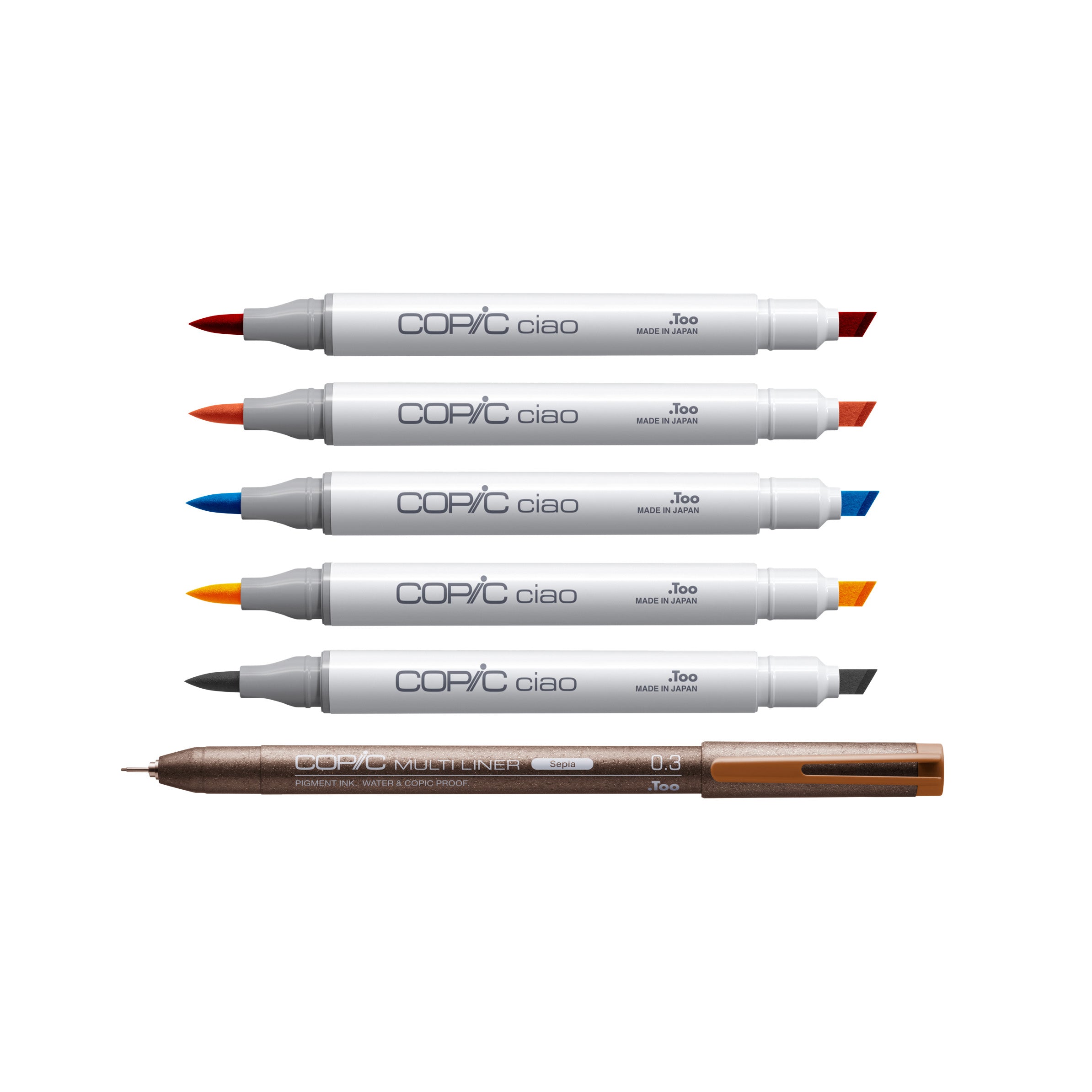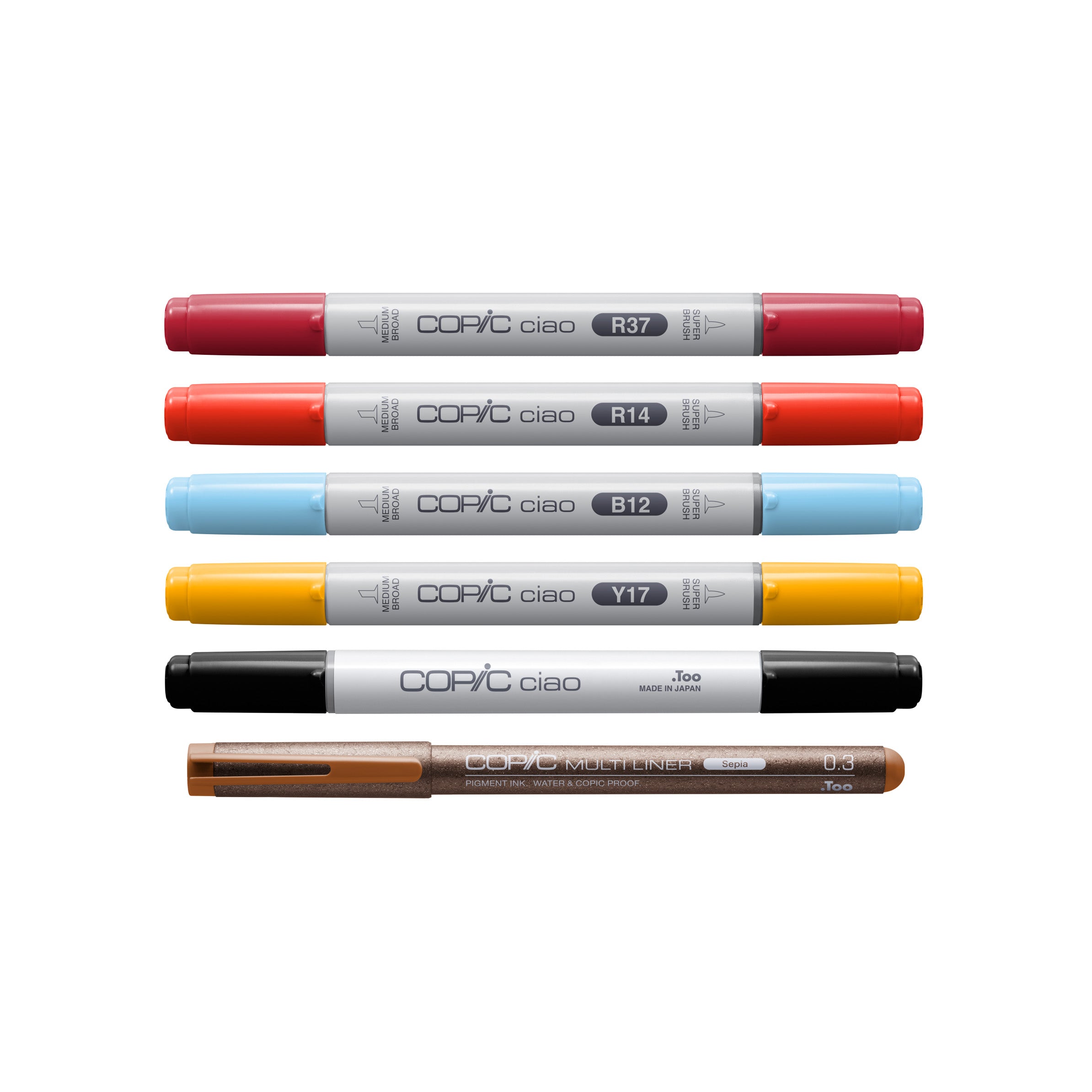 - COPIC® ciao Markers: Carmine R37, Light Rouge R14, Ice Blue B12, Golden Yellow Y17, Cool Gray C7