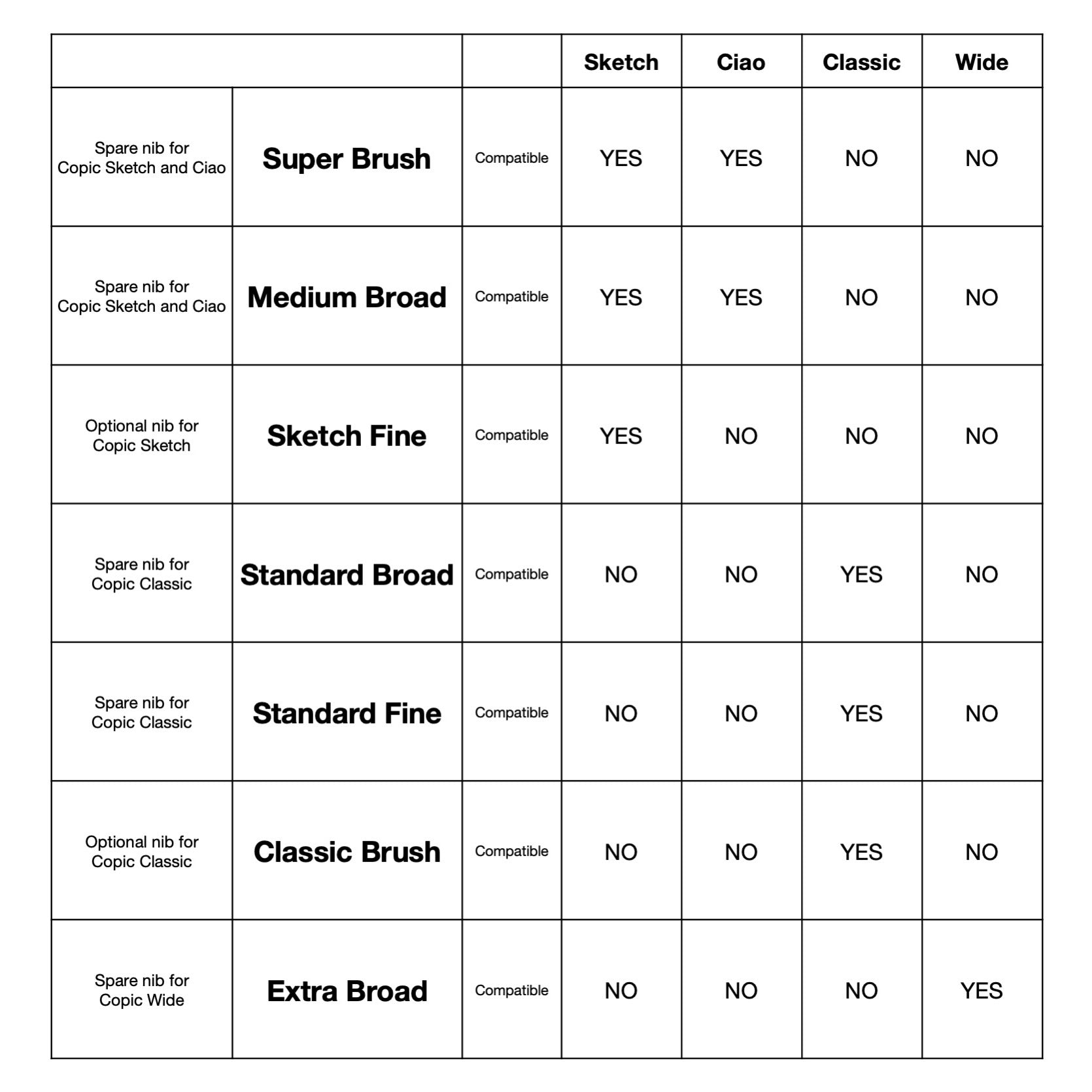 In addition, you can customize your markers by exchanging your included nibs for an optional nib. *Please note that the nibs used in the COPIC® Sketch and COPIC® ciao markers are different from COPIC® Classic markers.