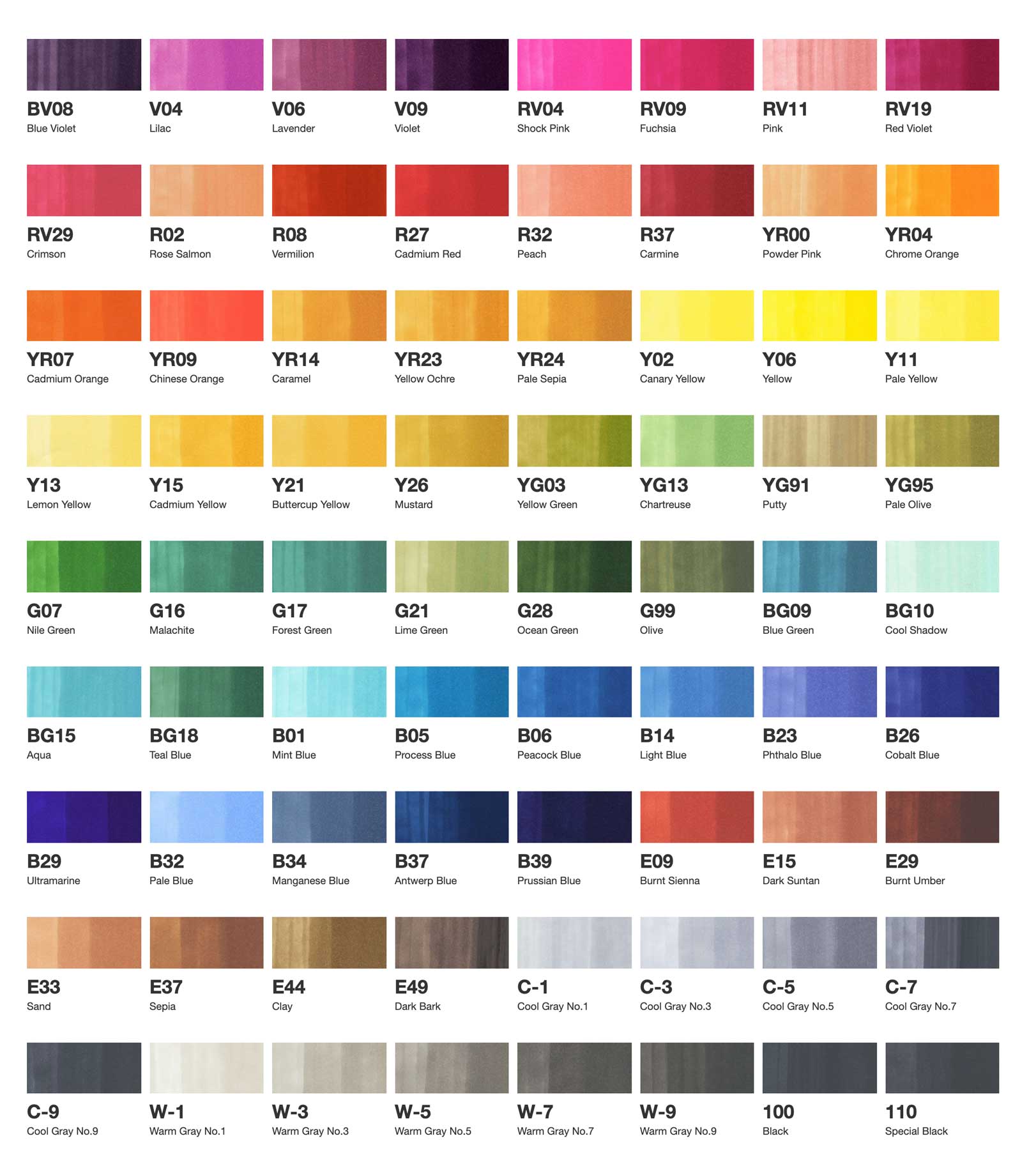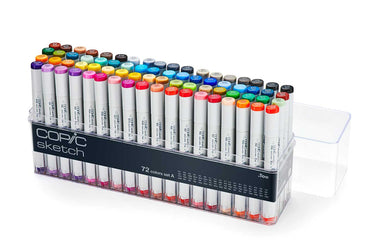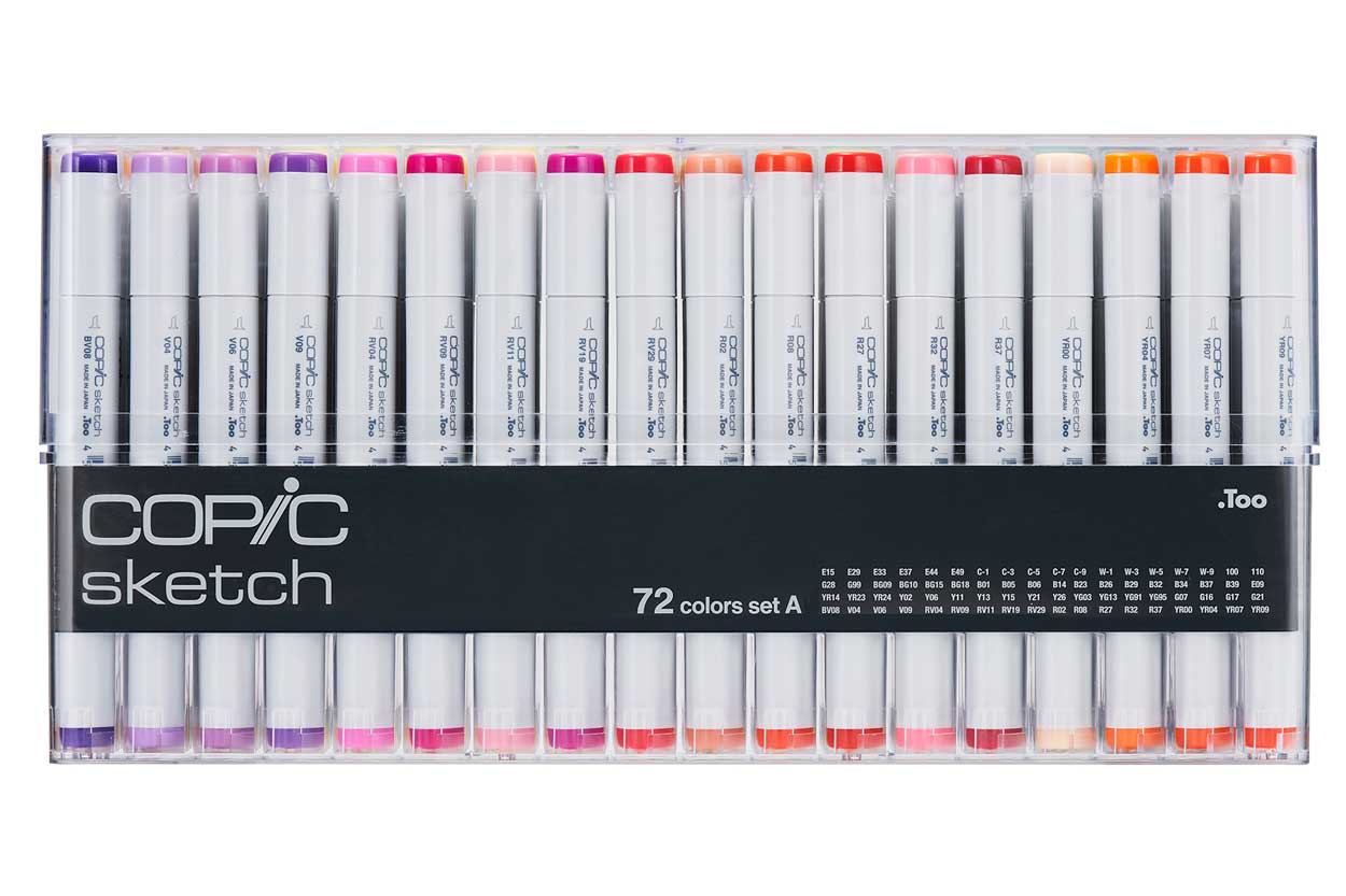 COPIC® Sketch 72PC Marker Set (A) includes: Cool Gray No. 1 C1, Cool Gray No. 3 C3, Cool Gray No. 5 C5, Cool Gray No. 7 C7, Cool Gray No. 9 C9, Warm Gray No. 1 W1, Warm Gray No. 3 W3, Warm Gray No. 5 W5, Warm Gray No. 7 W7, Warm Gray No. 9 W9, Black 100, Special Black 110, Mint Blue B01, Process Blue B05, Peacock Blue B06, Light Blue B14, Phthalo Blue B23, Cobalt Blue B26, Ultramarine B29, Pale Blue B32, Manganese Blue B34, Antwerp Blue B37, Prussian Blue B39, Blue Green BG09, Cool Shadow BG10, Aqua BG15, Teal Blue BG18, Blue Violet BV08, Burnt Sienna E09, Earthenware E15, Burnt Umber E29, Sand E33, Sepia E37, Clay E44, Dark Bark E49, Nile Green G07, Malachite G16, Forest Green G17, Lime Green G21, Ocean Green G28, Olive G99, Rose Salmon R02, Vermillion R08, Cadmium Red R27, Peach R32, Carmine R37, Shock Pink RV04, Fuchsia RV09, Pink RV11, Red Violet RV19, Crimson RV29, Lilac V04, Lavender V06, Violet V09, Light Orange Y02, Yellowish Green Y06, Pale Yellow Y11, Lemon Yellow Y13, Cadmium Yellow Y15, Buttercup Yellow Y21, Mustard Y26, Yellow Green YG03, Chartreuse YG13, Putty YG91, Pale Olive YG95, Powder Pink YR00, Chrome Orange YR04, Cadmium Orange YR07, Chinese Orange YR09, Caramel YR14, Yellow Ochre YR23, and Pale Sepia YR24
