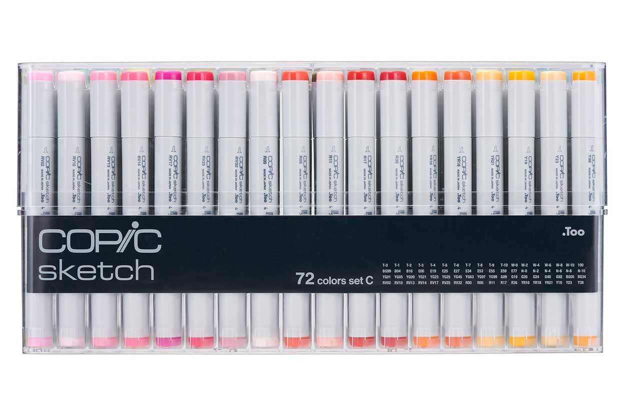 COPIC® Sketch 72PC Marker Set (C) includes: Neutral Gray No. 0 N0, Neutral Gray No. 2 N2, Neutral Gray No. 4 N4, Neutral Gray No. 6 N6, Neutral Gray No. 8 N8, Neutral Gray No. 10 N10, Toner Gray No. 0 T0, Toner Gray No. 1 T1, Toner Gray No. 2 T2, Toner Gray No. 3 T3, Toner Gray No. 4 T4, Toner Gray No. 5 T5, Toner Gray No. 6 T6, Toner Gray No. 7 T7, Toner Gray No. 8 T8, Toner Gray No. 9 T9, Toner Gray No. 10 T10, Warm Gray No. 0 W0, Warm Gray No. 2 W2, Warm Gray No. 4 W4, Warm Gray No. 6 W6, Warm Gray No. 8 W8, W10, Black 100, Tahitian Blue B04, Cyanine Blue B16, Holiday Blue BG05, Horizon Green BG34, Flagstone Blue BG99, Cotton Pearl E00, Redwood E19, Caribe Cocoa E25, Milk Chocolate E27, Toast E34, Raw Silk E53, Light Camel E55, Walnut E59, Maroon E77, Veronese Green G09, Bright Parrot Green G19, Wax White G20, Willow G24, Dim Green G40, Spring Dim Green G82, Pinkish White R00, Salmon Red R05, Pale Cherry Pink R11, Lipstick Orange R17, Coral R35, Sugared Almond Pink RV02, Pale Pink RV10, Tender Pink RV13, Begonia Pink RV14, Deep Magenta RV17, Dog Rose Flower RV25, Shadow Pink RV32, Napoli Yellow Y19, Yellowish Beige Y23, honey Y38, Green Bice YG01, Salad YG05, Lettuce Green YG09, Anise YG21, New Leaf YG23, Celadon Green YG25, Cobalt Green YG45, Pea Green YG63, Spanish Olive YG97, Marine Green YG99, Apricot YR16, Sanguine YR18, and Cream YR21