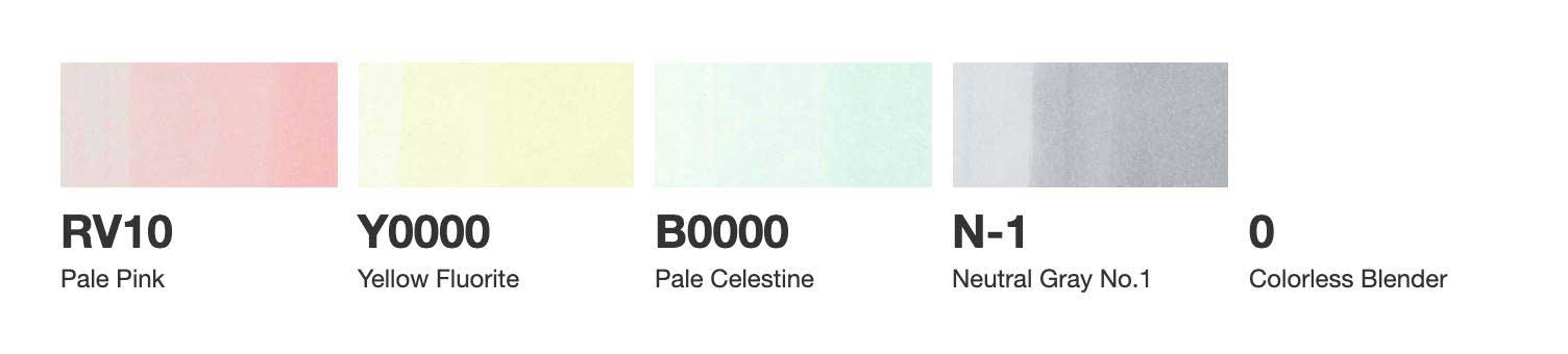 - COPIC® Sketch Markers: Pale Celestine B0000, Neutral Gray No. 1 N1, Pale Pink RV10, Yellow Fluorite Y0000, and Colorless Blender 0