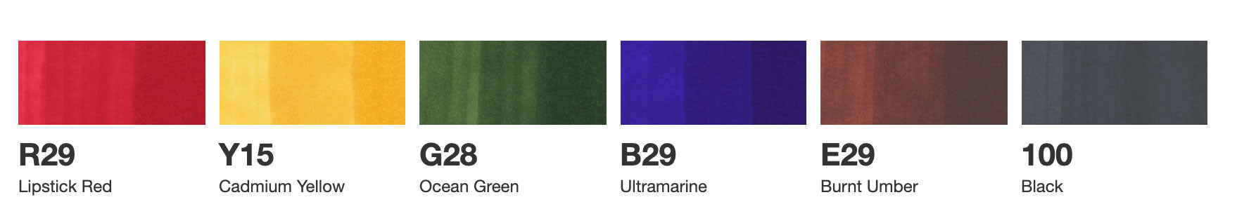 COPIC® Sketch Bold Primaries 6PC Set includes: Black 100, Ultramarine B29, Burnt Umber E29, Ocean Green G28, Lipstick Red R29, and Cadmium Yellow Y15