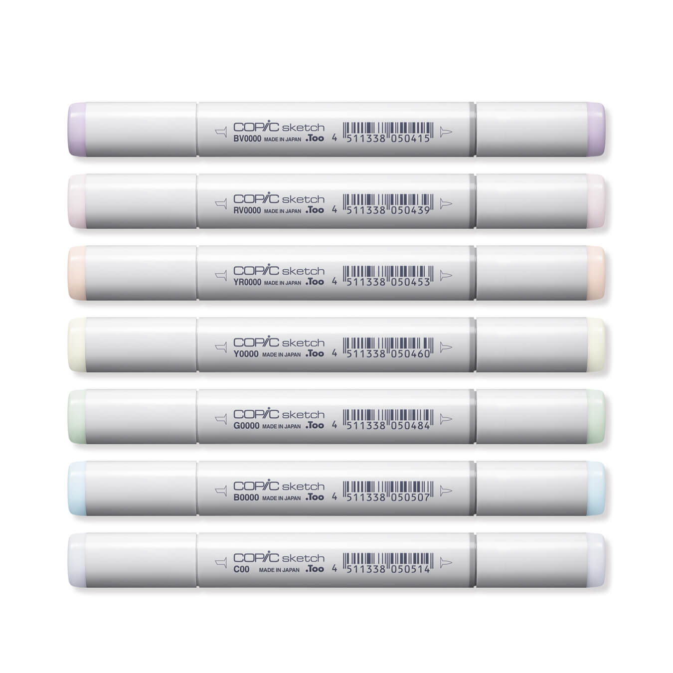COPIC® Sketch: Limited Edition Airy Tones 6+1 Set includes: Evening Primrose RV0000, Pale Chiffon YR0000, Yellow Fluorite Y0000, Crystal Opal G0000, Pale Celestine B0000, Pale Thistle BV0000, Cool Gray No. 00 C00