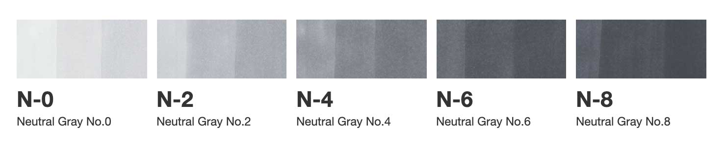 - COPIC® Sketch Markers: Neutral Gray No. 0 N0, Neutral Gray No. 2 N2, Neutral Gray No. 4 N4, Neutral Gray No. 6 N6, and Neutral Gray No. 8 N8